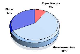 Governamentais 89 deputados governamentais, do chamado bloco liberal. Governo venceu em quase todo o país, à excepção de Lisboa, Setúbal, Viseu e Porto, onde apenas obteve minorias, e de Aveiro, Castelo Branco e Arganil, onde não obteve nem maiorias nem minorias. |